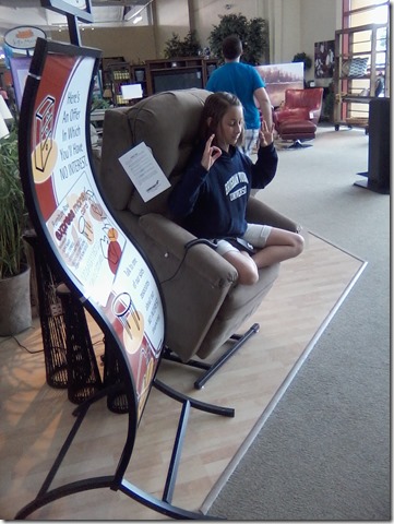We decided once I got a full time library job the 1st thing we would do is replace our kitchen table. We bought it about 12 years ago. The chairs have been falling apart as evidenced by what happened when Tyler sat on one this week. So, we went to a furniture store yesterday to see what was out there. We found a beautiful granite/Marble square table with these comfy chairs and we were sold. I cant wait until its delivered!! (These are pictures from the store)'