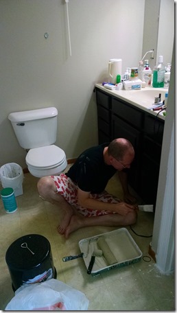 Here you can see the new colors of the bathroom.  Bob stained the cabinets and we got rid of the lavender after 11 years.  It’s a beautiful soothing color and I love it.  Plus I always get a kick out of the fact that Bob is always fixing toilets or things by the toilets on his days off!